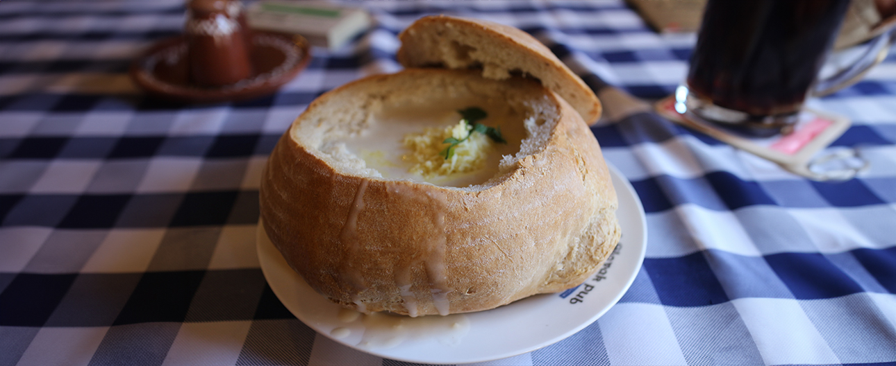 The bread bowl itself is part of the magic—crusty on the outside and soft inside, gradually soaking up the creamy soup for a rustic, cozy finish. a perfect balance of hearty Slovak comfort food and European dining elegance.